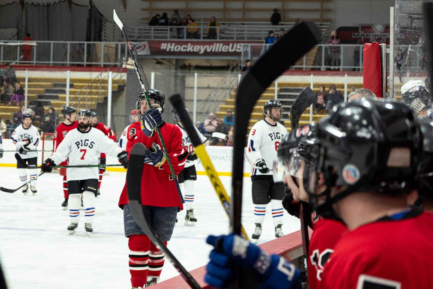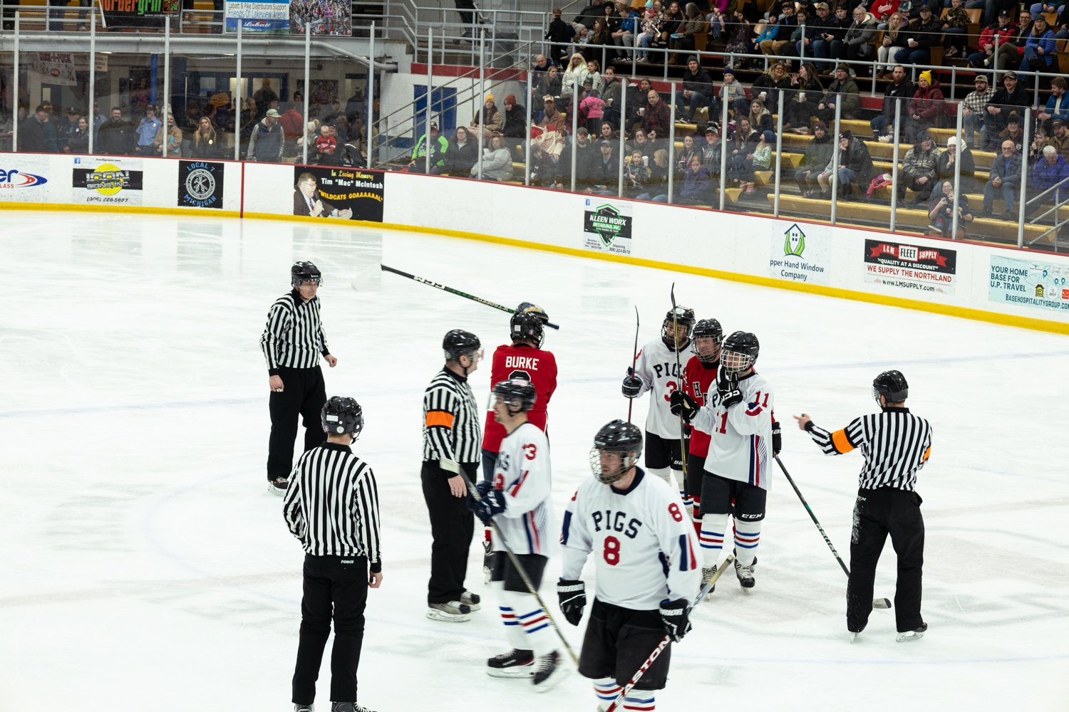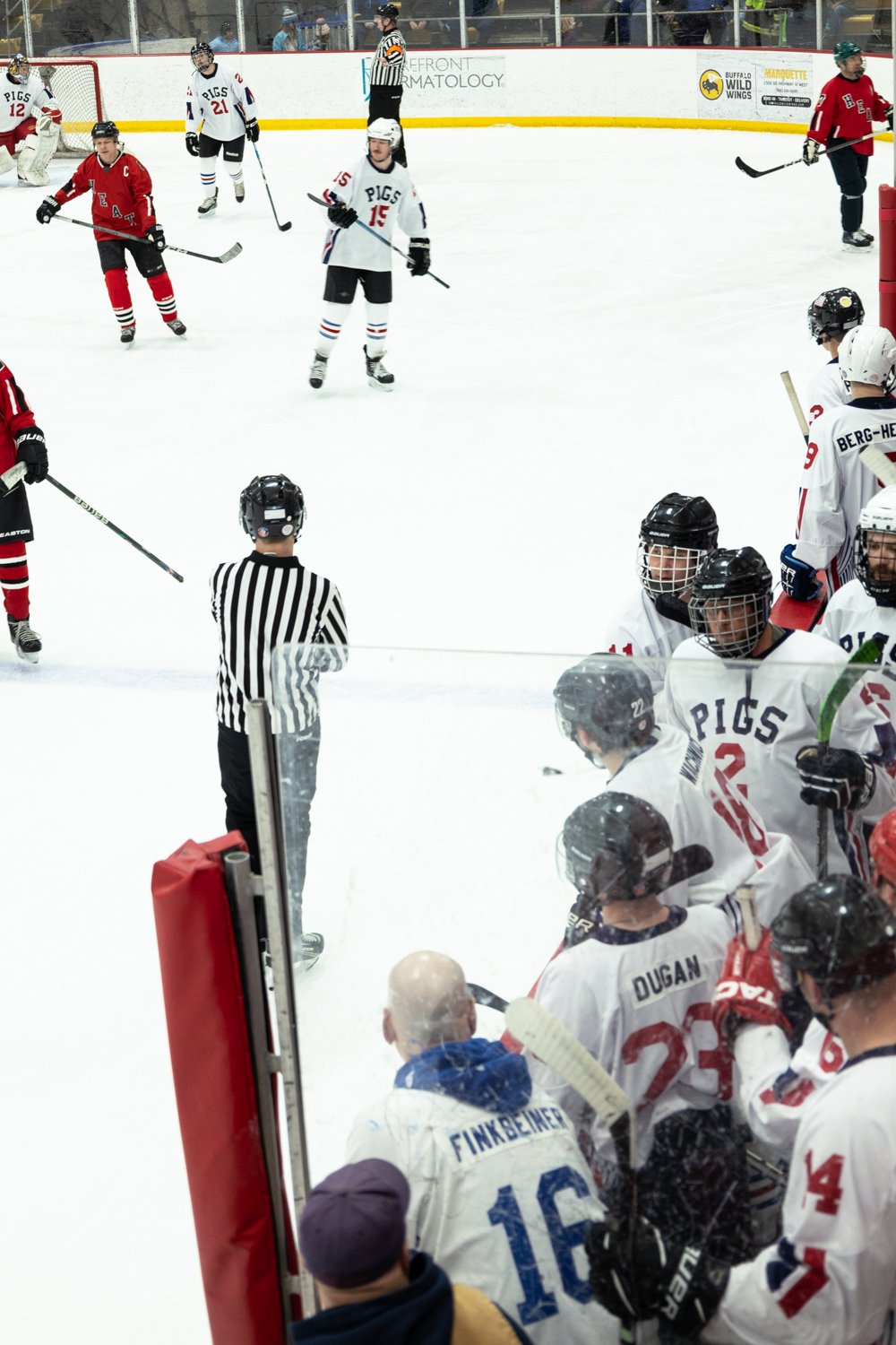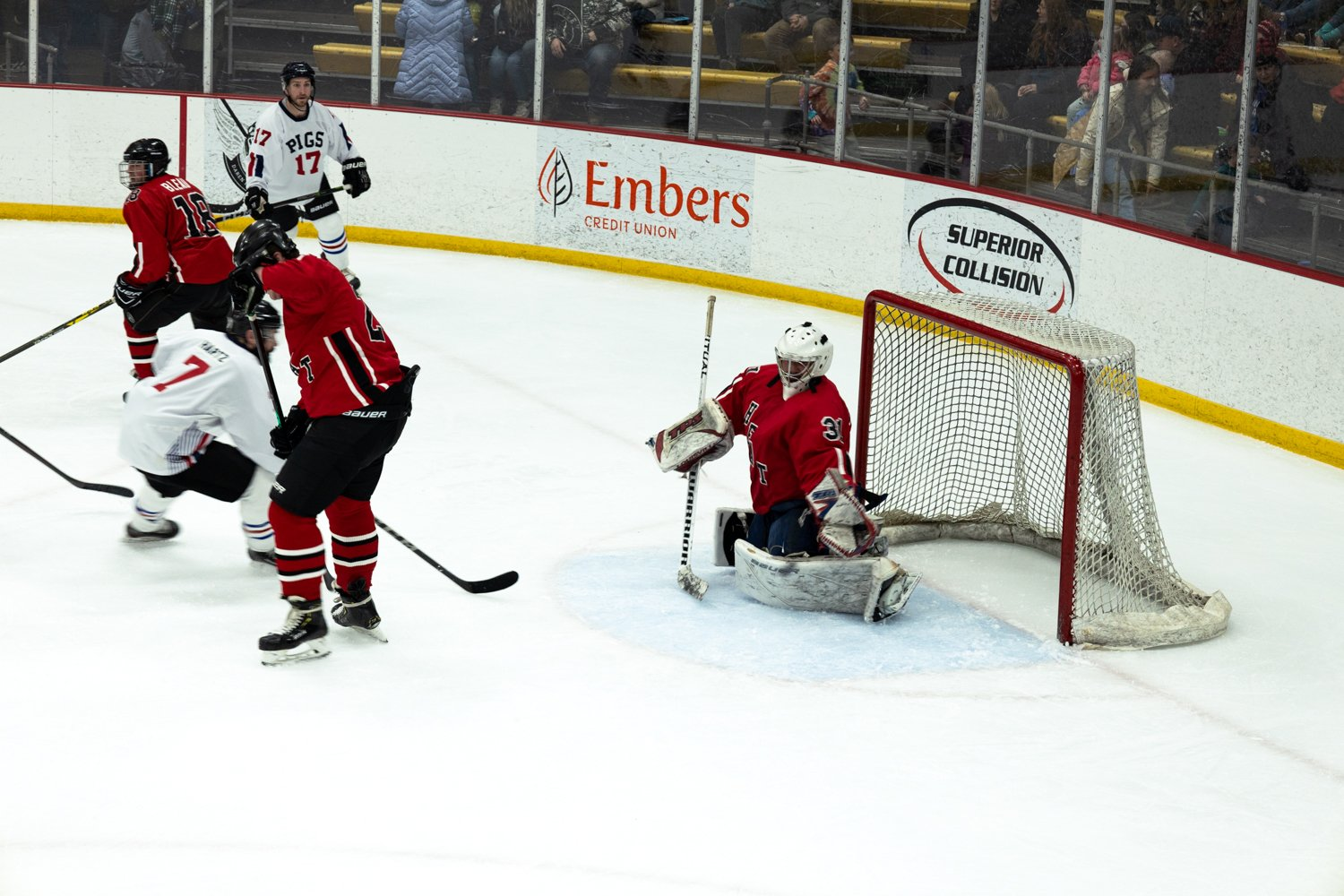What first began when Marquette City Police Officer Larry Grimsby, Michigan State Trooper Dave Rotteman, and Marquette City Firefighter Dan Dagenais wanted to raise money to assist a family with three young children whose home had just been lost to a fire. Flash forward 40 years; today the Pigs-N-Heat Charity hockey game draws between 2,500–3,000 people and raises approximately $15,000 to $20,000. While there is a trophy to play for and a bit of an established rivalry, this friendly game is also a way to honor and celebrate both Firefighter and Policeman of the year.