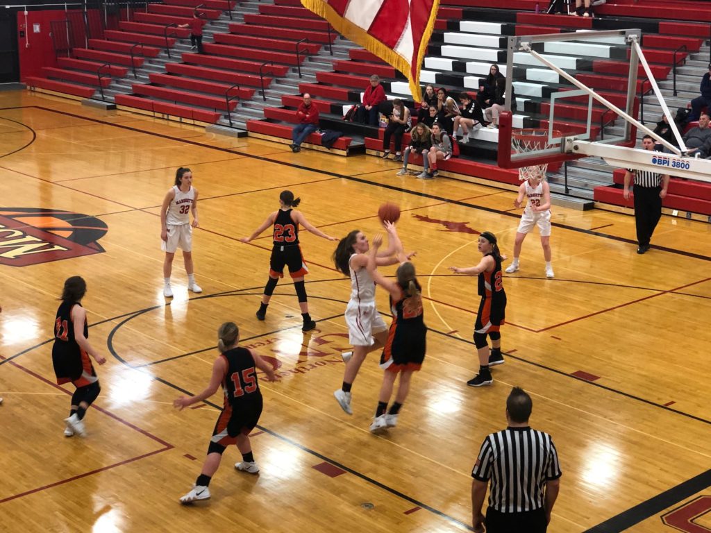 All Redettes in the fourth quarter. Running clock showed 3:20 in the quarter; 75-16 Marquette over Houghton. Marquette’s basketball with 30 seconds to go in the game. Up and over the rim for Madison Carter. We end the game with Marquette having a HUGE game as they defeat Houghton 78-18!