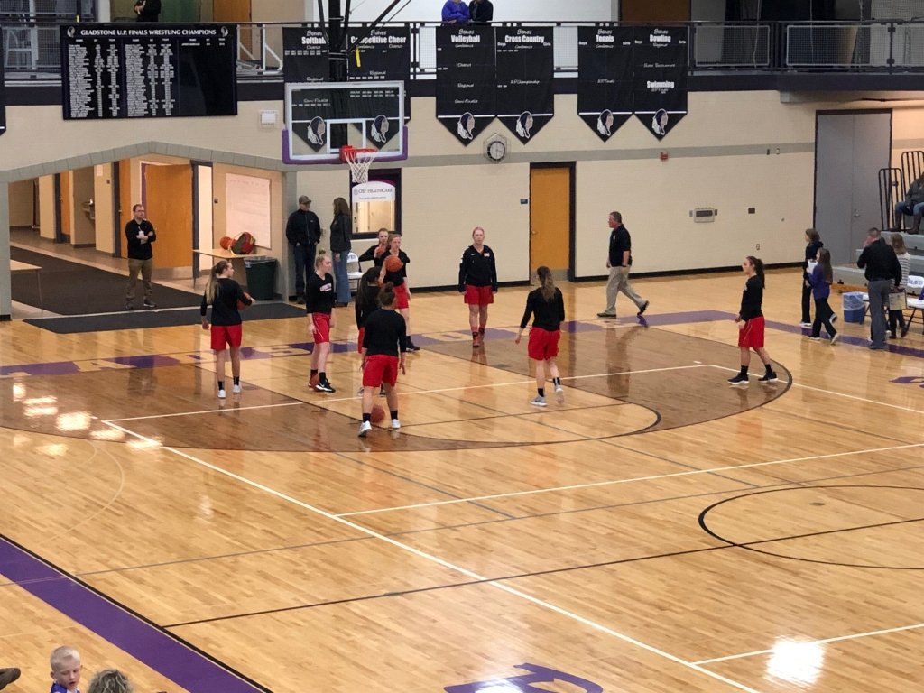 The Marquette Girls Varsity Basketball Team warming up on the Gladstone court.