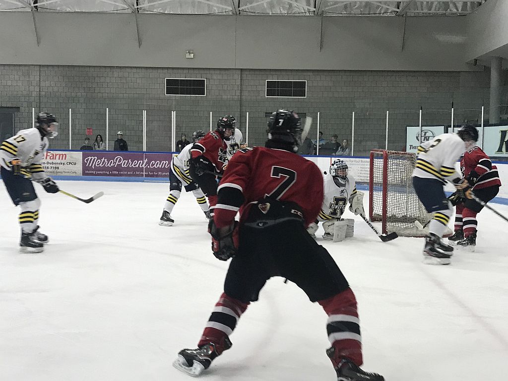 The Redmen take a shot on goal.
