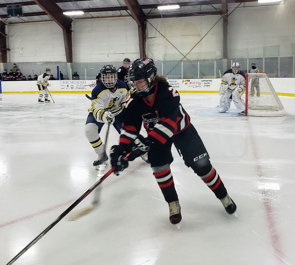 Marquette’s Dylan Baldwin controls the puck in the Negaunee zone