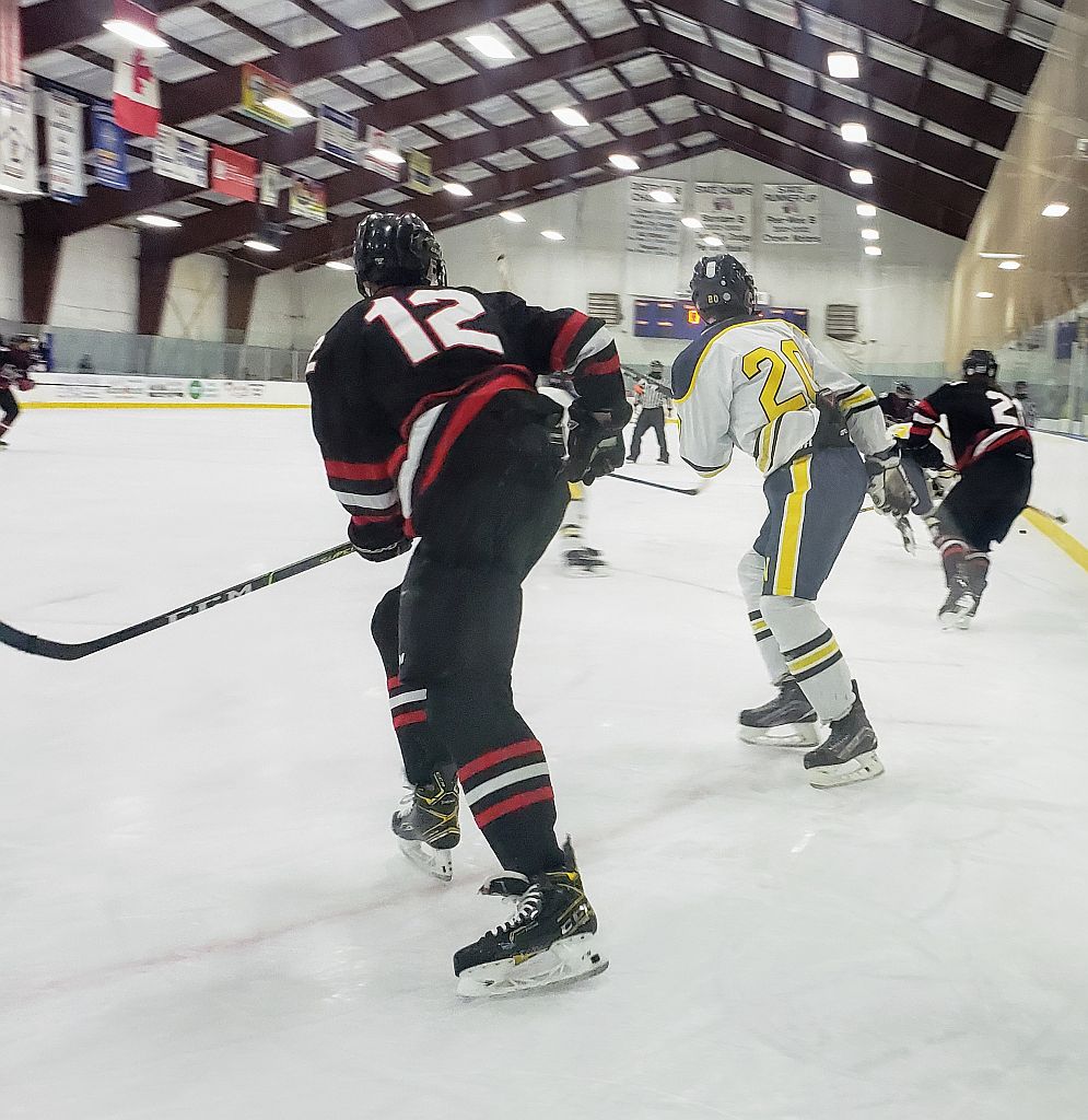 Jackson Potulny, who scored a hat-trick for Marquette, watches the play develop